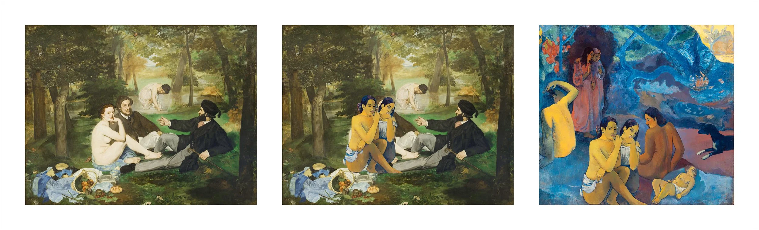 My work entitled ‘Manet to Gauguin (after Manet and Gauguin)’ 2024 expands on my research into the representations of gender non-binary people in the Pacific and their relationship to the development of modernism including Impressionism. On the left features an unchanged Edouard Manet’s 1863 painting entitled 'Le Déjeuner sur l'herbe (the luncheon on the grass)' and on the right a cropped version of Paul Gauguin’s, 'Where do we come from? What are we? Where are we going?' 1897–98, which was set in Tahiti. In the middle- section, I’ve imposed the Tahitian couple from Gauguin’s painting into Manet’s pastoral scene placed in front of the white couple posing in a similar manner in order to highlight the uncanny resemblance between the two paintings which seem to suggest that Gauguin's major painting may have been inspired by Manet’s painting. Additionally, the work tracks the trajectory from the almost universal representation of white people to the romantic and sexualised depiction imposed on Polynesian people by Gauguin.