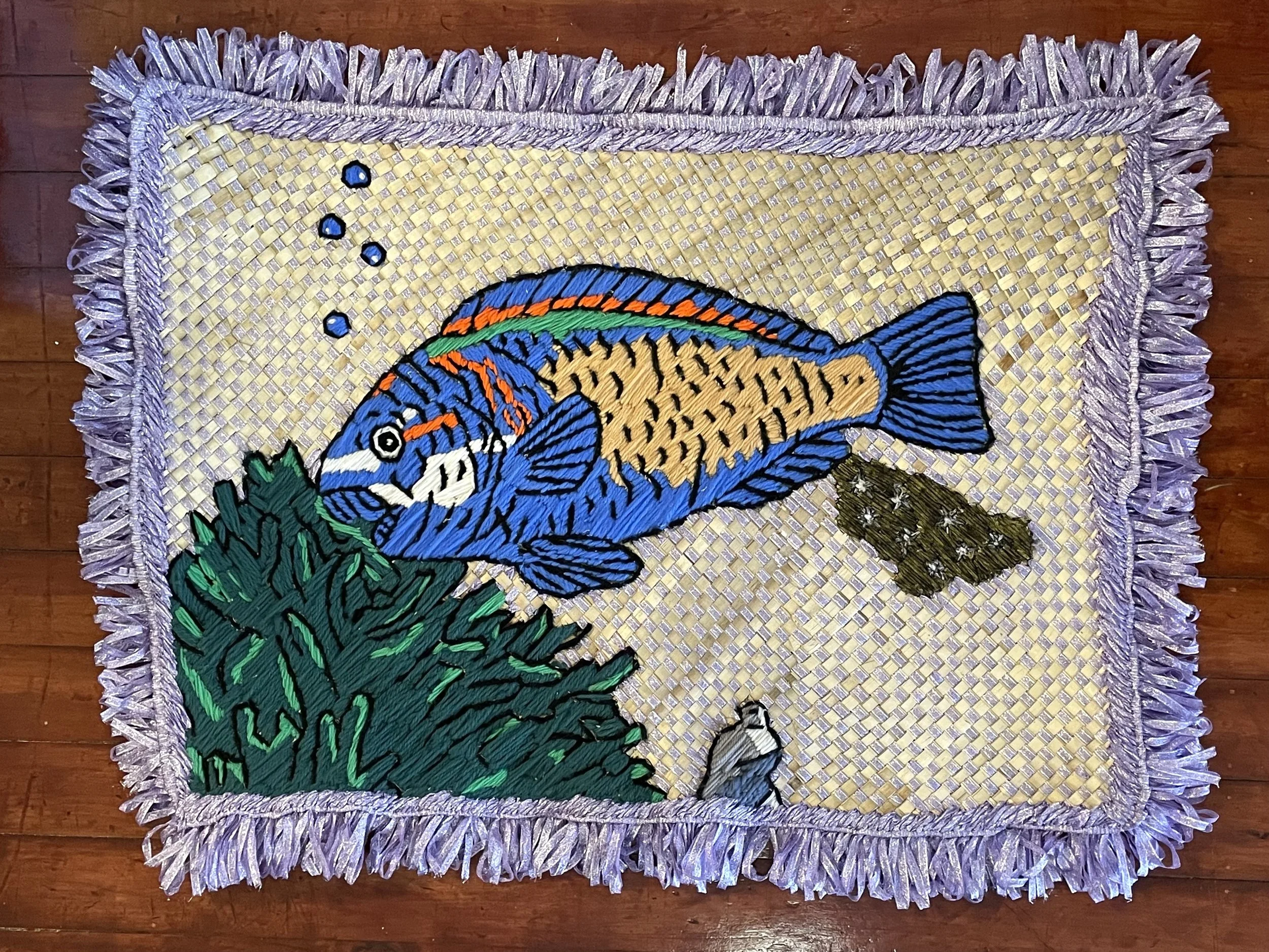 The ‘Moana Queer Taxonomy’ (2026) comprises 12 embroidered pandanus mats also known as fala su‘i in Sāmoa. Each fala su’i features a marine life with its Sāmoan name as an act of reclamation from Western taxonomy rooted in colonial frameworks of classification.
